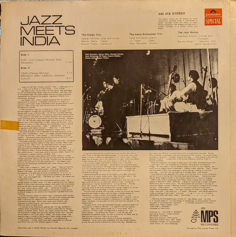 ドイツ<MPS>に残された、ジャズ・ミュージシャンと世界の民族音楽家とのセッション・アルバム、1967年のインド編。UK press. 全体に薄くチリあり。ジャケ、テープ跡。